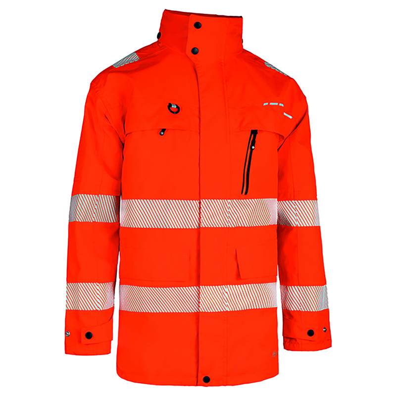75% Ripstop Polyester with a 25% PU Laminate 210gsm fabric weight Medium weight jacket. Bird eye mesh liner allows for Level 4 breathability with an Ret of 9.55 Concealed right breast pocket Chest pocket with laminated water resistance zip D ring hook for security or ID pass Detachable concealed 3 panel fully adjustable hood Full length zip for complete closures Hi viz accents for added styling External stud adjuster for cuff Inside pocket for phone Concealed zip pocket to storm flap Double Studded snorkel fleece lined neck Fully taped seams Soft touch zip pulls on all zips Internal wicking strip to reduce water ingress Fleece lined zip cover at nape of neck. Segmented tape to shoulders for additional visibility Generous sizing to interact with other garments 60mm segmented tape for greater visibility Jacket can be used in combination with the Interactive bodywarmer (BSDBWTT) EN ISO20471:2013 Class 3 RIS-3279-TOM Issue 2:2019 (Orange variations only) EN343:2019 Class 4 Water Penetration Class 4 Air Permeability