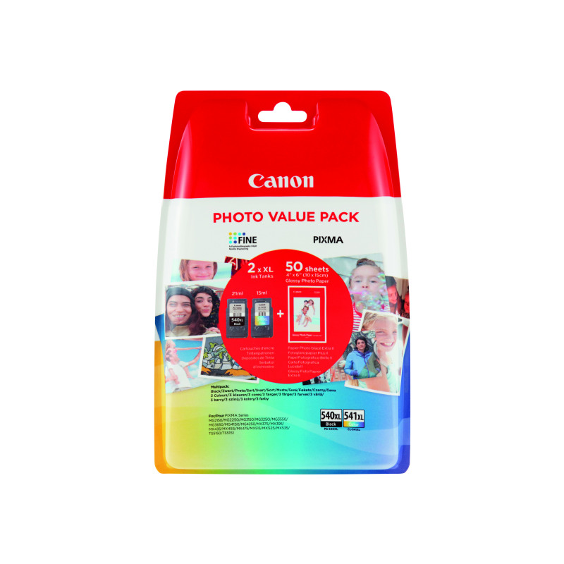 Print your documents and photos with a convenient value pack that includes PG-540L Black and CL-541XL Colour ink cartridges as well as 50 sheets of 10x15 cm Glossy Photo Paper for your PIXMA printer. Print up to 300 pages with the 11 ml black ink cartridge and up to 400 pages with the 15 ml colour ink cartridge at ISO/IEC 24711¹ standard.